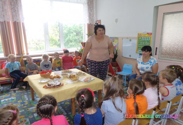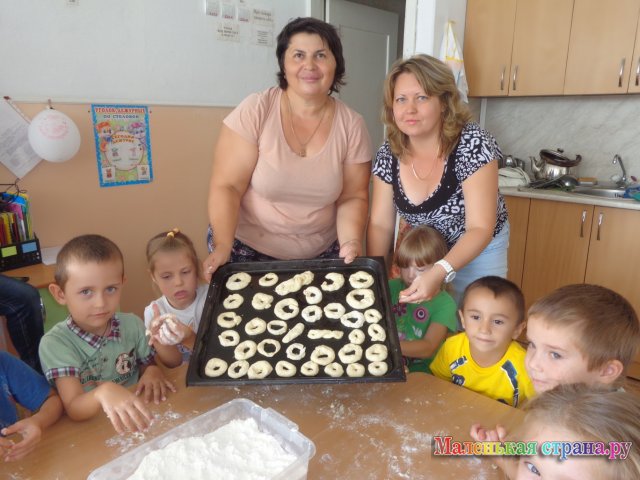 - Замешивание теста и выпечка булочек в детском саду.