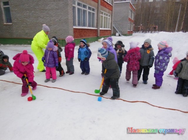 Посреди площадки расположен снежный вал. Дети поточным методом выполняют упражнения, самостоятельно выбирая способ перепрыгивания через вал, стараясь не задеть его ногами.