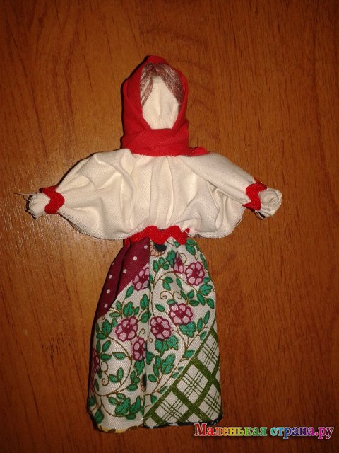 3. Сарафан. Сложи 2 оставшихся куска цветной ткани , так же как для рук, но не перевязывай. Сверху положи заготовку головы, На месте талии свяжи детали. Положи на куколку крест на крест части сарафана. Острые уголки вверху, как и руки. Замотай на талии. Кончики заверни за плечи и еще раз замотай нитками. Расправь руки. Укрась куклу кружевами, тесьмой. Уголки одежды подравниваем ножницами.