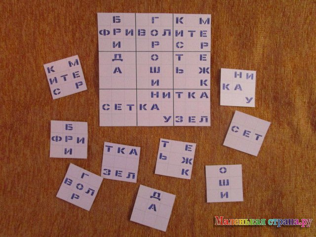 Материал: большая карточка с кроссвордом (образец), маленькие карточки со слогами.